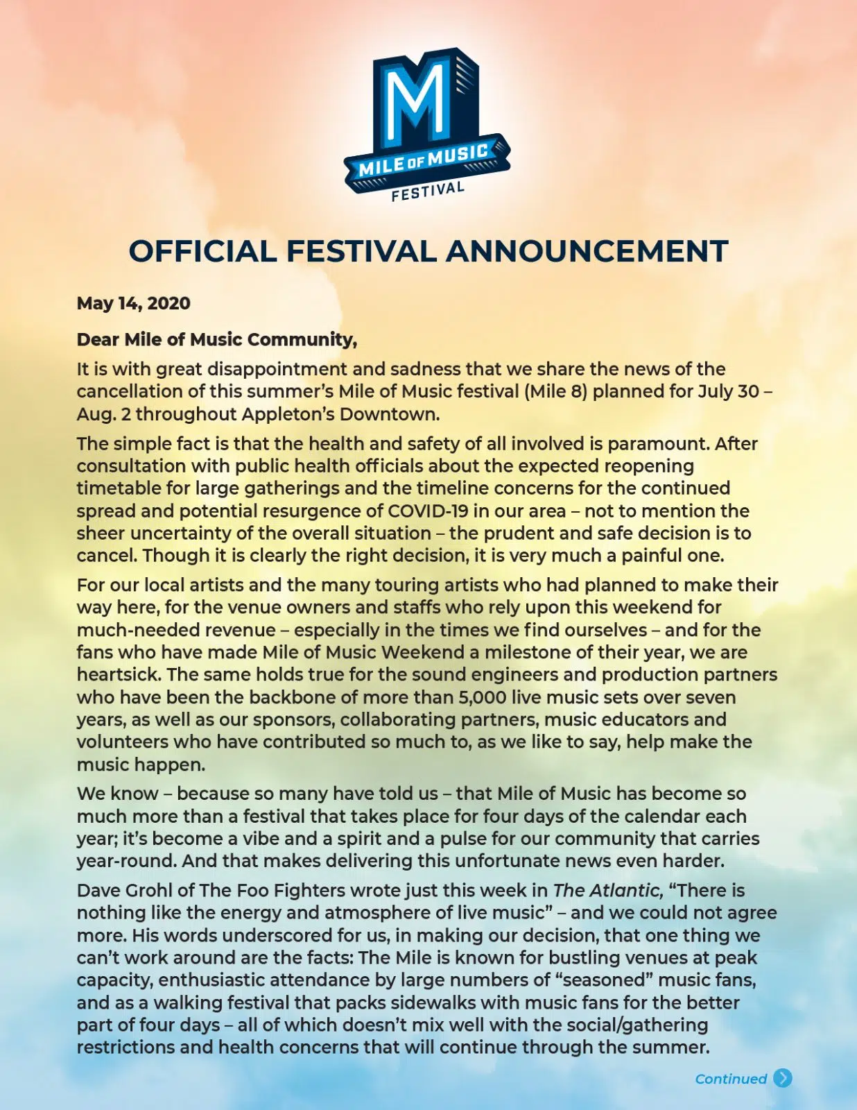 The producers of Appleton’s Mile of Music have announced the cancellation of the multi-day, all-original music festival for 2020.
