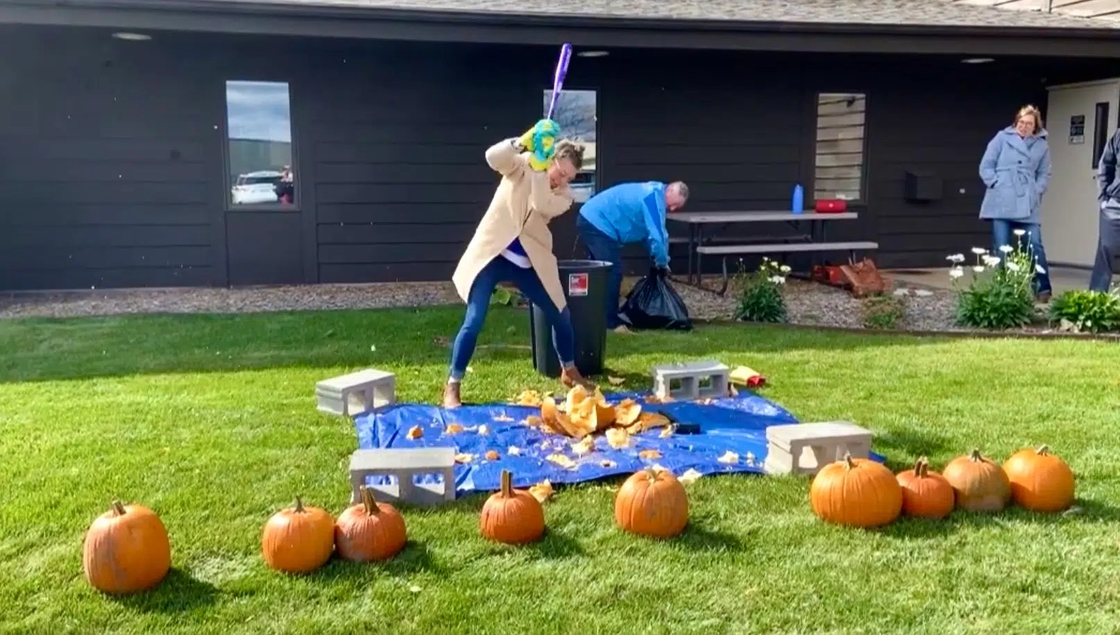 This week Woodward Radio Group staff let their frustrations out on some pumpkins who I’m told really had it coming! It’s interesting to see each person’s personal pumpkin smashing style. All pumpkin shells and guts were then donated to Saving Snouts, the sanctuary for rescued pigs in Kaukauna. (By the way, I was today years old when I learned there was a sanctuary for rescued pigs in Kaukauna)