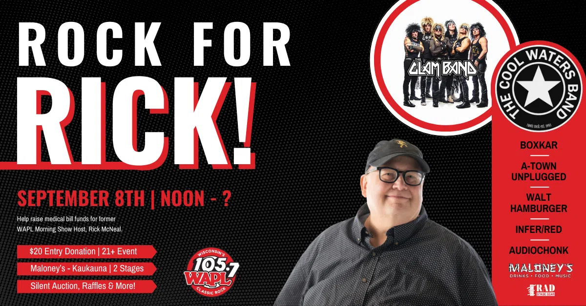 Join us on September 8 at Maloney’s in Appleton for Rock For Rick, a benefit concert to help raise funds for former WAPL Morning Show Host, Rick McNeal. The event kicks off at 12 PM and will feature live music, a silent auction, raffles, delicious food, drinks, and more!