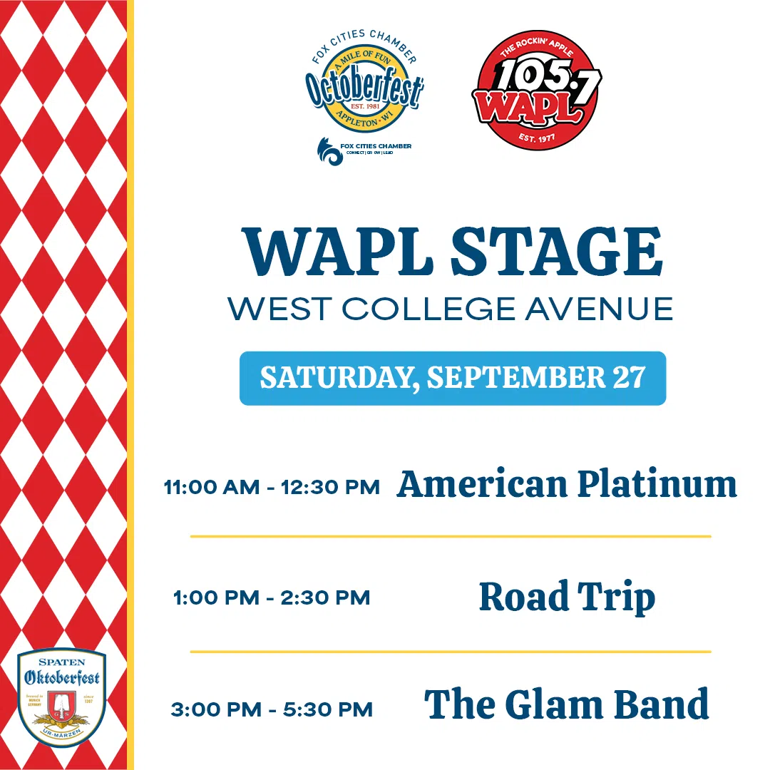 APPLETON'S OCTOBERFEST, WITH THE FOX CITIES CHAMBER OF COMMERCE, SPATEN OKTOBERFEST BEER, AND THE ROCKIN' APPLE... 105.7 WAPL!
